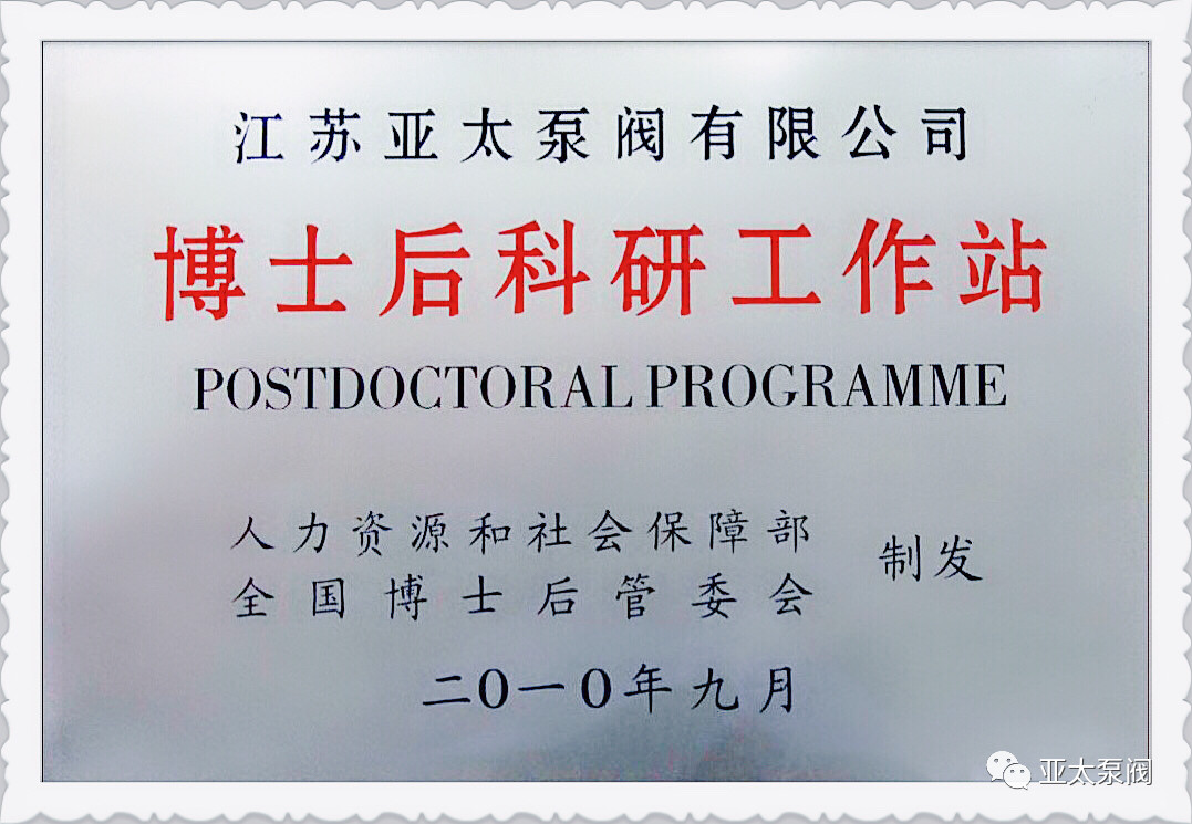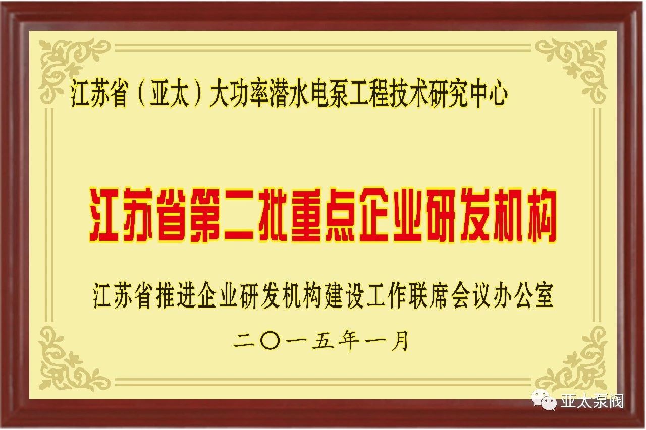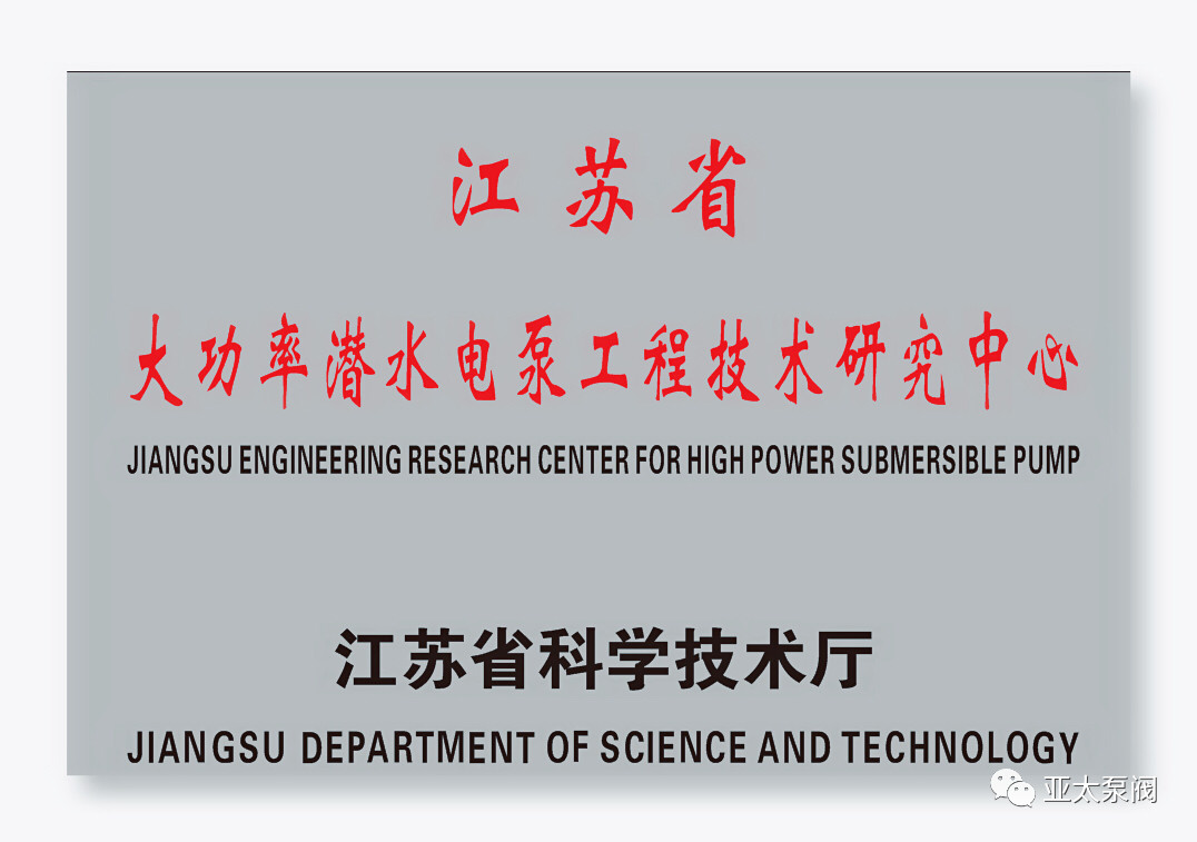 亞太泵閥有限公司是專業(yè)從事大功率潛水電泵及泵站系統(tǒng)研究的國家高新技術(shù)企業(yè),企業(yè)先后獲批國家博士后科研工作站、江蘇省企業(yè)技術(shù)中 心、江蘇省大功率潛水電泵工程技術(shù)研究中心、江蘇省研究生工作站等省級平臺,技術(shù)創(chuàng)新能力顯著增強,先后獲得國家科技二等獎1項、省部級科技進步獎12項、承擔國家和省級研發(fā)項目11項、主持和參與制訂國家和行業(yè)標準8項。此次成功獲批省特大型潛水電泵及泵站系統(tǒng)工程研究中心,成為亞太泵閥第5個省級以上研發(fā)平臺。