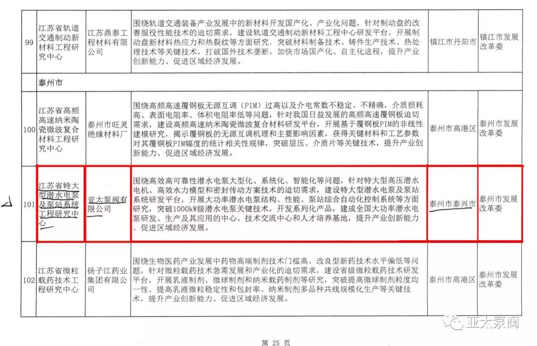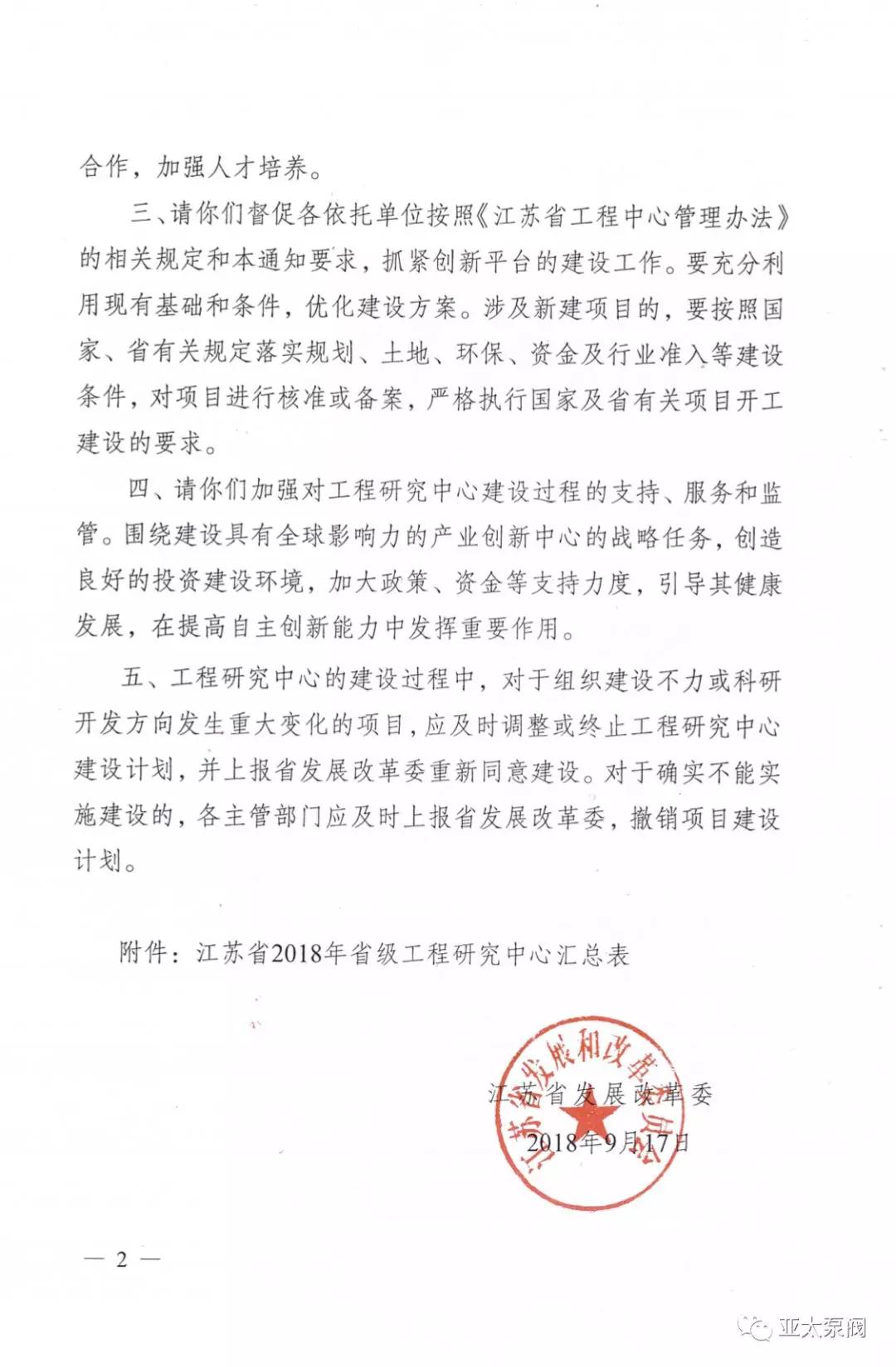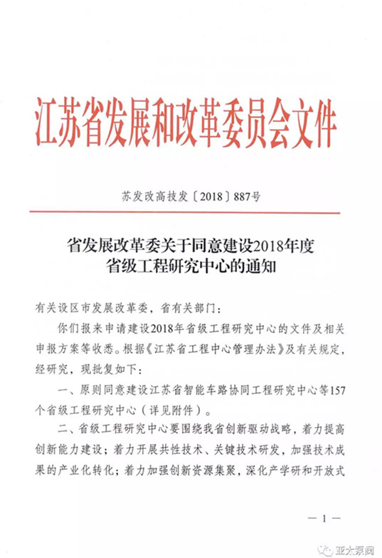 近日,省發(fā)改委正式發(fā)文,同意建設(shè)2018年度省級工程研究中心,亞太泵閥有限公司申報的省級創(chuàng)新平臺江蘇省特大型潛水電泵及泵站系統(tǒng)工程研究中心成功獲批,成為我省水泵行業(yè)唯 一入選企業(yè)。